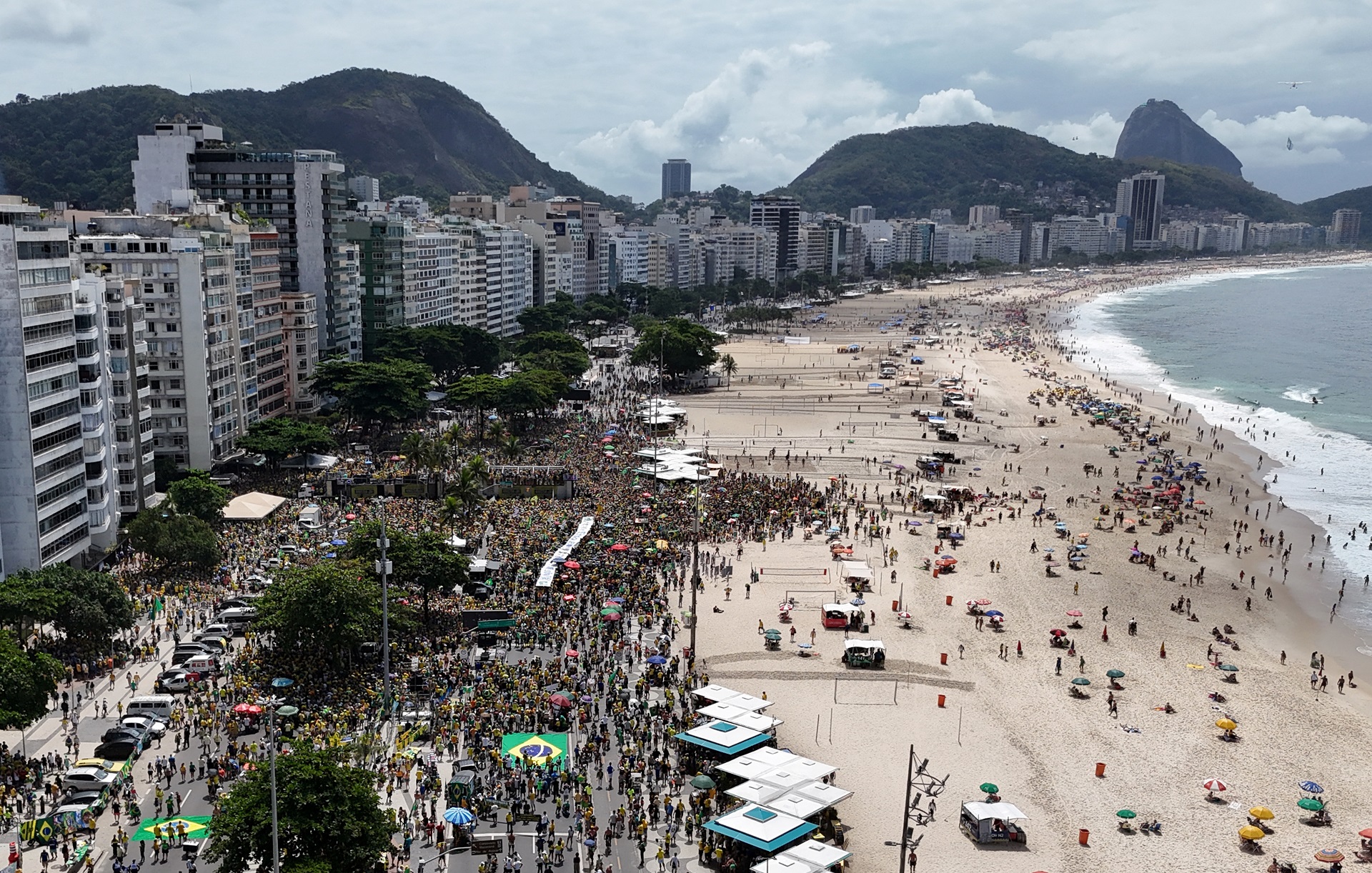 Uma visão de drone mostra apoiadores do ex-presidente brasileiro Jair Bolsonaro, durante uma manifestação na praia de Copacabana, no Rio de Janeiro, Brasil, em 16 de março de 2025. REUTERS/Pilar Olivares