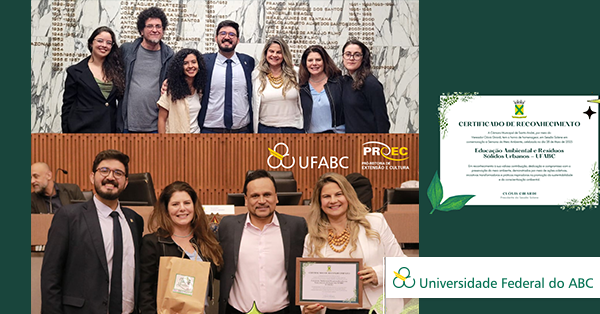 A equipe do Projeto de Extensão “Educação Ambiental e Resíduos Sólidos Urbanos na Região do ABC: do estado atual à realidade desejada“, recebeu no dia 28 de maio de 2025 uma homenagem da Câmara de Vereadores de Santo André pelos serviços prestados à comunidade, por intermédio do projeto de extensão. A homenagem ocorreu durante a Sessão Solene pela abertura da Semana do Meio Ambiente.