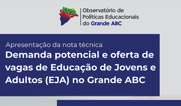 O Grupo de Trabalho que se debruça sobre as questões que envolvem a Educação de Jovens e Adultos (GT-EJA), do Observatório de Políticas Educacionais do Grande ABC, lançará na tarde do dia 9 de março de 2026 uma Nota Técnica que analisa a relação entre oferta e demanda da modalidade no Grande ABC. Também apresentará um painel de dados relativos ao tema. O evento será realizado das 14 às 18h na sede do Consórcio Intermunicipal Grande ABC, à Av. Ramiro Colleoni, 5 (próximo ao Paço Municipal de Santo André, ao lado do Colégio Singular).
